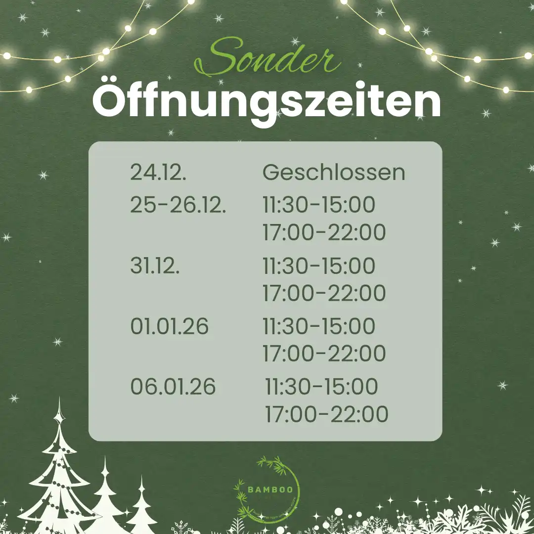 Reservieren Sie noch heute Ihren Tisch im Bamboo Restaurant, um einen harmonischen Abend mit Ihren Liebsten zu erleben. Mit der Bestätigung der E-Mail ist die Reservierung verbindlich. Wir freuen uns auf Ihren Besuch!
